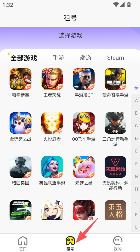 打开乐游租号后点击租号选项,进入租号板块并挑选目标游戏。