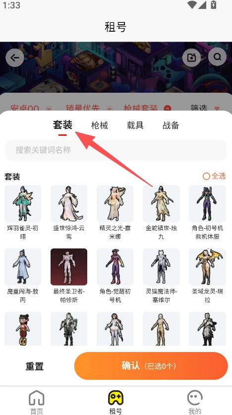 支持账号配置筛选功能,用户选定游戏后,可进一步筛选套装等具体配置,从而缩小账号租赁的选择范围。