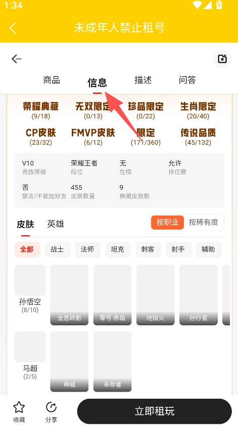 您可以先进入账号信息页面查看具体详情,确认无误后点击“立即租玩”按钮,这样就能完成账号租赁流程了。