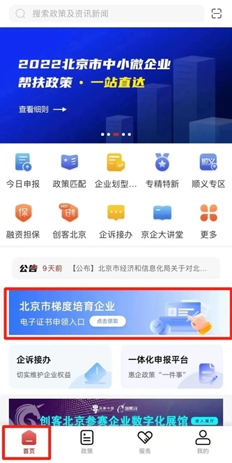 登录北京通企服版后,在首页找到北京市梯度培育企业电子证书的申领入口,点击该入口进行后续操作。