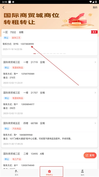 切换至“转租转让”页面,就能查看国际商贸城各个商位的转租转让信息,像商位位置、经营行业、联系方式等内容都包含在内。