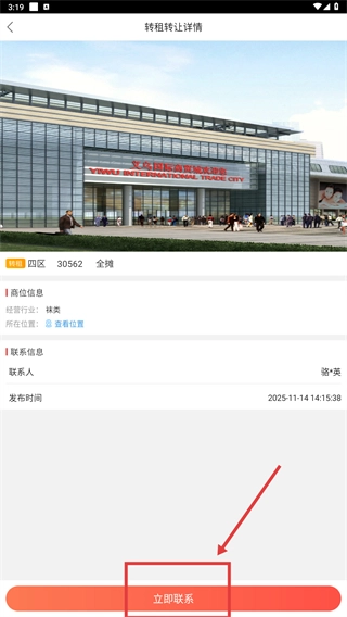 点击目标商位条目进入详情页后,能够查看该商位的详细信息,比如经营行业、所在位置等内容,点击【立即联系】按钮即可发起沟通。