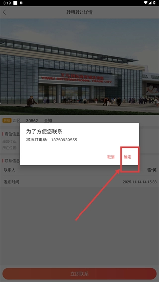 在联系确认弹窗中,点击【确定】按钮,就能拨打对应的联系方式,和商位转租转让方开展对接。