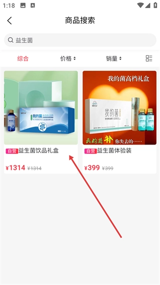 在搜索结果页面找到目标商品(例如益生菌饮品礼盒),点击进入该商品的详情页。