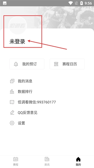 进入【我的】页面后,页面显示当前处于【未登录】状态,该页面包含【我的预订】【赛程日历】等功能,这些功能需要登录后才能使用。