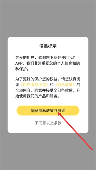 启动后会弹出温馨提示窗口,此时点击【同意隐私政策并继续】按钮,即可完成隐私条款的确认并进入到后续页面。