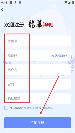 在注册页面按顺序填写【手机号】【验证码】【用户名】【密码】【确认密码】,完成注册信息的填写。