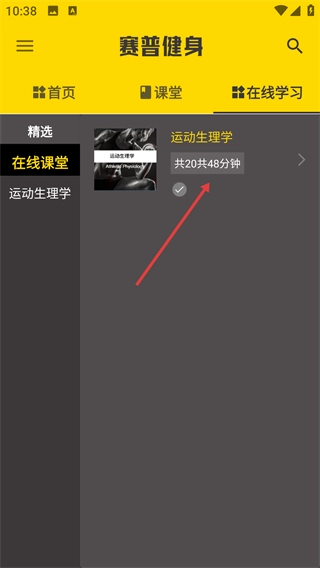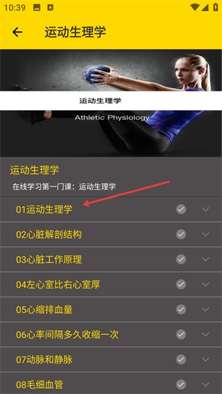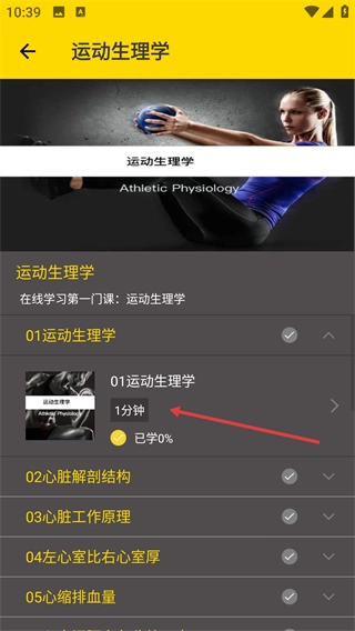 在课程章节列表里,找到对应的章节(例如【01运动生理学】),点击它的展开按钮,就能看到该章节具体的学习内容了。
