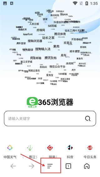 在【365浏览器】的首页,点击底部的菜单按钮,就能展开功能操作菜单,之后就可以进行各类和浏览器功能相关的操作了。