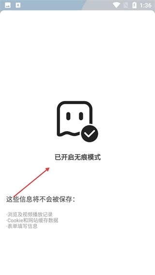 完成操作后会显示【已开启无痕模式】,开启后浏览记录、Cookie等信息将不会被该浏览器保存。