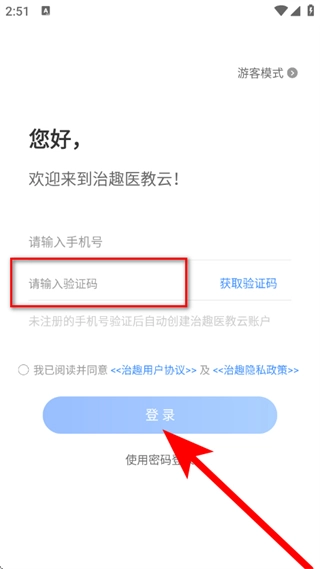 在输入框里填写验证码,勾选相关协议后,点击登录按钮,即可完成登录操作。