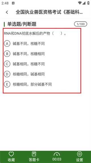 完全遵循全国执业兽医资格考试大纲的要求,全面涵盖基础、预防、临床、综合应用这四大科目的所有考点。题库类型丰富多样,无论是基础知识点的积累阶段,还是考前冲刺的关键时期,都能提供有力支持,具有极强的备考针对性。