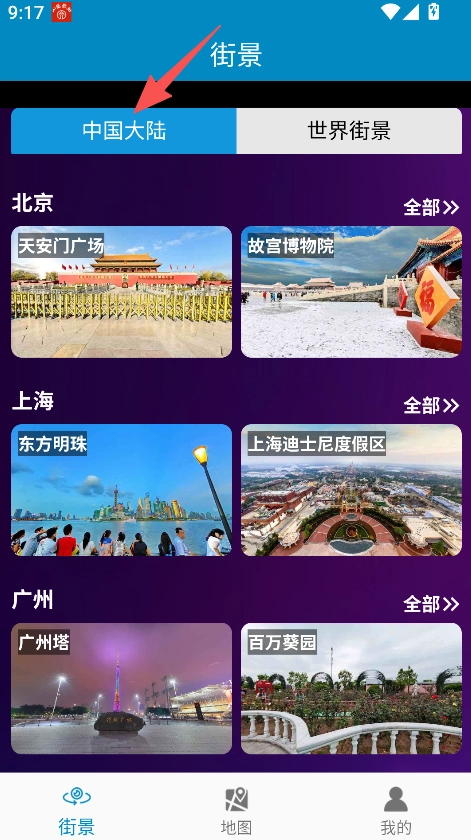 分为中国大陆与世界街景两大板块,覆盖北京、上海、广州等地的地标景点,通过呈现各地景观,满足不同区域的街景浏览需求。