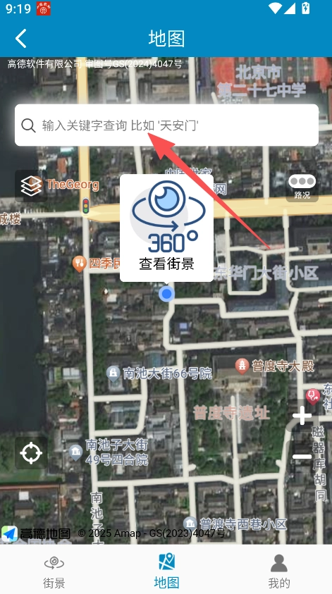 进入地图页面,输入关键词点击查看对应街景。