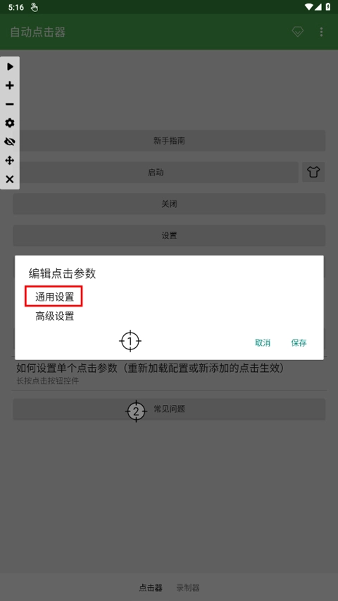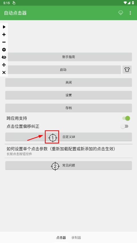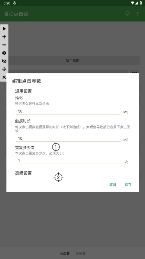 主界面底部支持点击器与录制器的切换操作,录制器的功能是记录用户的操作序列,点击器则用于执行相关任务,需要注意的是在修改点击参数之后。