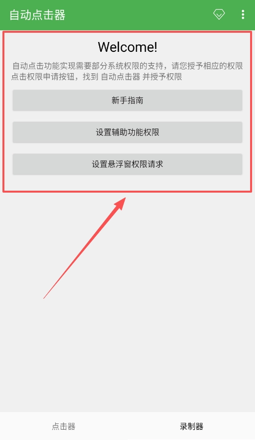 首要任务是点击权限申请按钮,为自动点击器开启辅助功能与悬浮窗权限,如此后续的自动点击和录制功能才能顺利激活并正常使用。