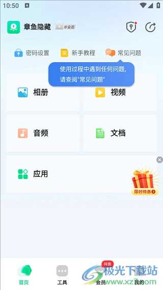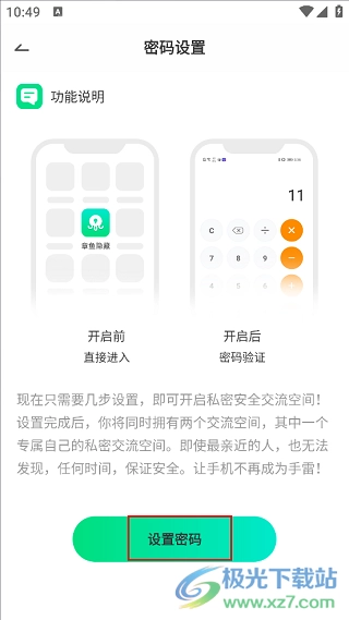 打开从本站安装的章鱼隐藏应用,进入首页后,点击上方菜单栏里的“密码设置”选项。