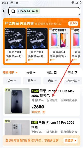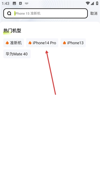 在搜索页面点击热门机型标签(例如【iPhone14Pro】),即可迅速找到该机型商品的搜索结果列表。