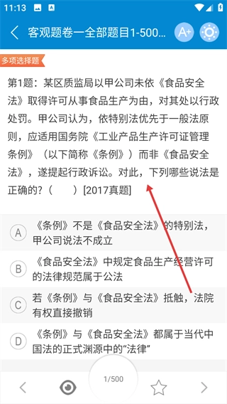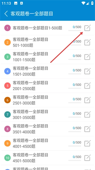 在题目分组列表里,找到并选择【客观题卷一全部题目1-500题】这个分组,然后进入该分组对应的题目练习界面。