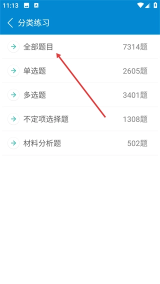 在分类练习界面,点击【全部题目】选项,即可进入客观题卷一的题目分组列表页面。