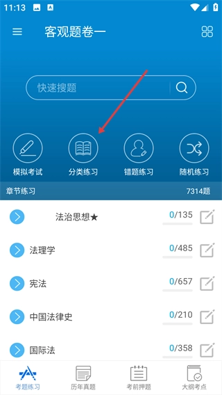 在客观题卷一页面,点击【分类练习】选项,进入题目类型的分类选择界面,可按题型筛选练习。