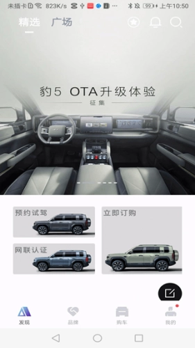 进入软件首页后,既能预约试驾或新车,也能进行网联认证。