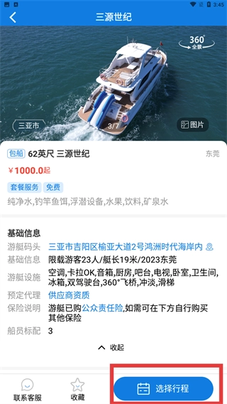 在游艇详情页面,浏览完基础信息和设施介绍后,点击【选择行程】按钮。