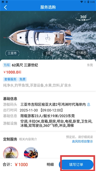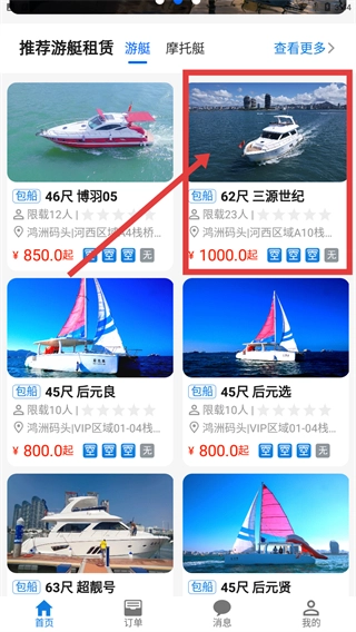 在推荐游艇列表里,挑选你想要的目标游艇(比如“62尺三源世纪”),然后进入它的详情页面。