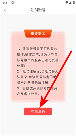 仔细阅读重要提示后,点击“申请注销”按钮,随后依照页面指引的流程逐步完成账号注销操作。