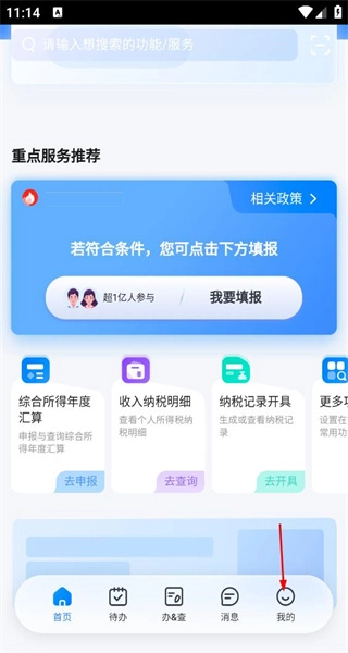打开个人所得税首页,浏览重点服务推荐板块的内容,接着点击页面底部的“我的”按钮,即可进入个人相关页面。