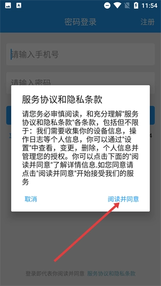 当【服务协议和隐私条款】的弹窗弹出后,请仔细阅读条款内容,然后点击【阅读并同意】按钮,完成协议确认,这样就能继续进行后续的操作了。