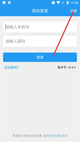 在密码登录页面,点击右上角的【注册】按钮,即可从登录流程切换到账号注册的操作界面。