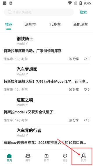在应用的主页面,你可以浏览各类汽车相关的资讯内容;要是需要进入个人中心,只需点击底部导航栏里的【我的】选项,就能跳转到包含个人相关功能的页面了。