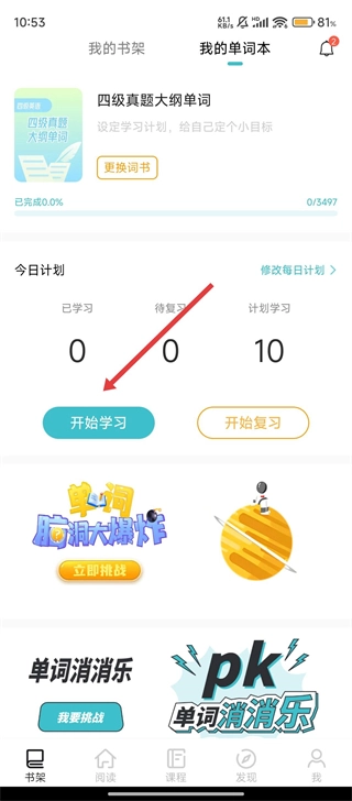 我们打开英语读书软件,进入【我的单词本】页面后点击【开始学习】,启动今日的单词学习计划。