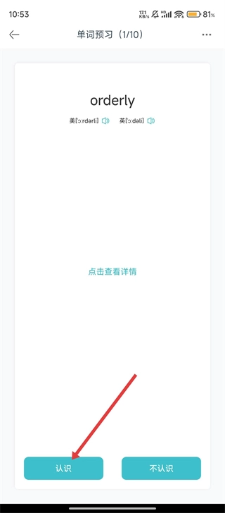 我们在【单词预习】页面,针对【orderly】这个单词,通过选择【认识】或【不认识】来标记自己的掌握情况。