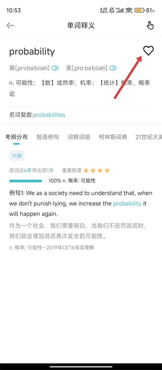 在【单词释义】页面,点击心形图标收藏【probability】,就能查看它的释义和例句了。