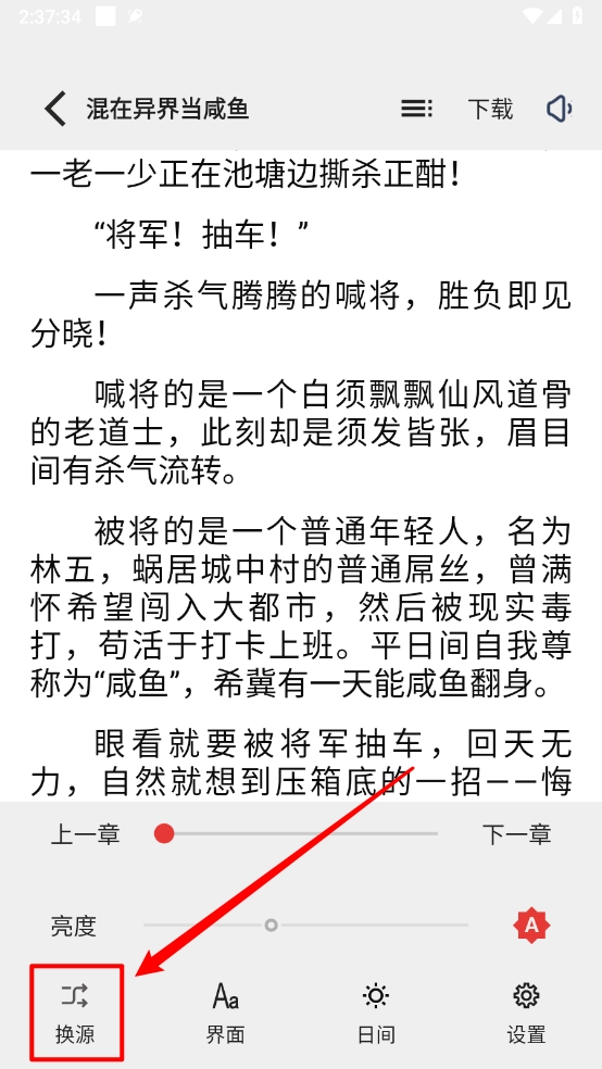 接着在阅读界面轻点中间的阅读区域,调出菜单后,点击“换源”选项。