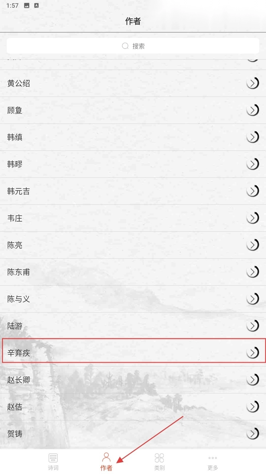 点击页面底部的【作者】按钮,进入作者列表页面,即可查看相应作者的诗词作品。