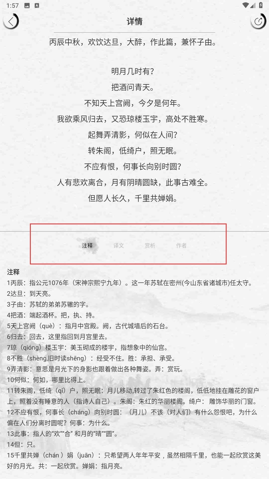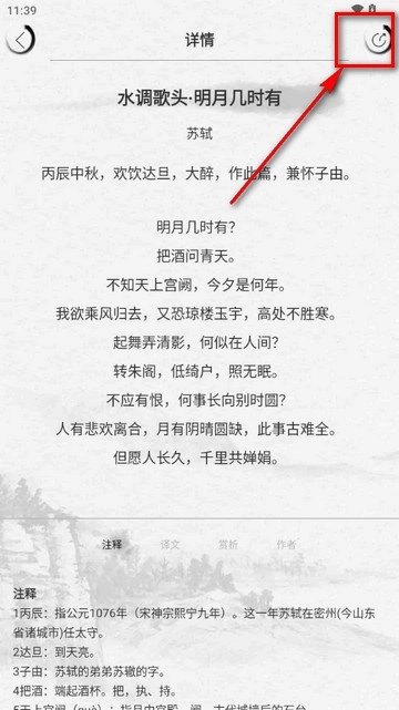 详情页能够切换【注释】【译文】【赏析】【作者】等板块,便于了解诗词相关信息。