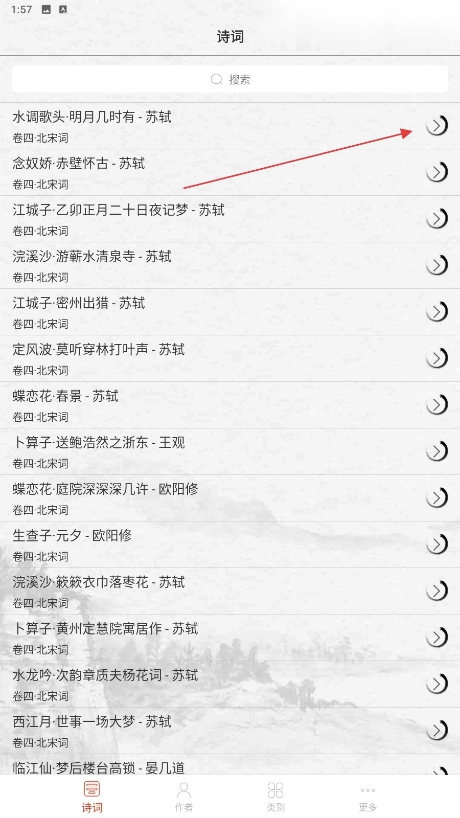 在“诗词”列表页面,点击诗词右侧的按钮,即可进入详情页查看具体内容。