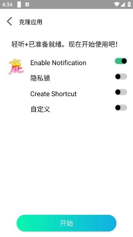 用户可以自定义选择是否开启通知、隐私锁、创建快捷方式等选项,之后点击开始即可。