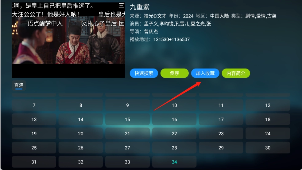 打开喜欢的影视进入播放页面,点击“加入收藏”。