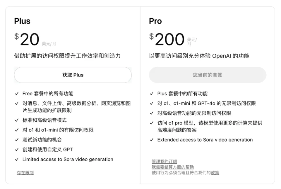 ChatGPT的付费用户目前已能使用Sora,付费方案分为Plus和Pro两档,二者权益各有不同。