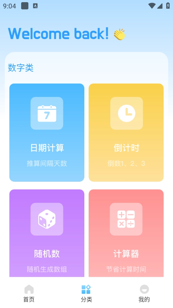“分类”页面主要涵盖了数字类工具,像日期计算、倒计时以及随机数生成等功能都包含在内。