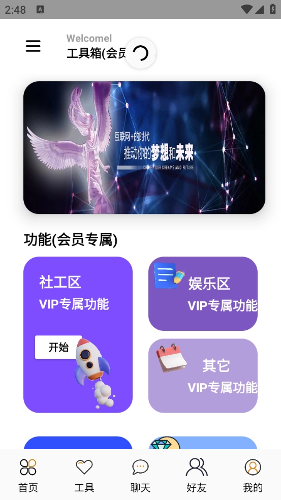 “工具”板块设有丰富的工具分类,涵盖社工区、娱乐区、图标库等类别。