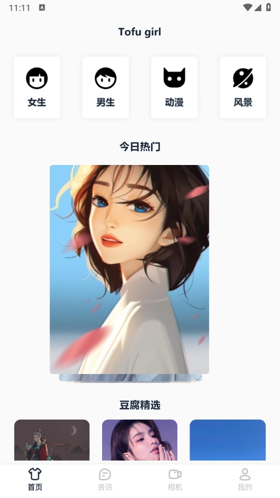 豆腐女孩皮肤是一款壁纸资源丰富的软件,涵盖男生、女生、动漫等多种风格分类。每个分类下都有大量优质高清壁纸,能让手机桌面更美观,所有新资源均免费提供,感兴趣的用户可以来体验。