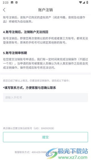 进入账户注销页面后,在页面下方的输入框填写你的手机号码,接着点击提交按钮就可以了。