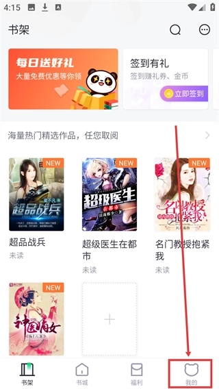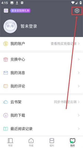 在【书架】页面,点击底部导航栏中的【我的】按钮,即可进入个人中心界面。