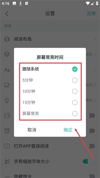 在【屏幕常亮时间】的弹窗中,选定你想要的时长选项后,点击【确定】按钮即可完成相关设置。