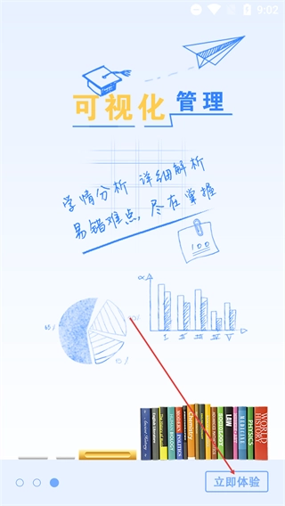 进入具备【可视化管理】功能的页面后,点击【立即体验】按钮,就能查看学情分析以及易错难点的可视化数据。